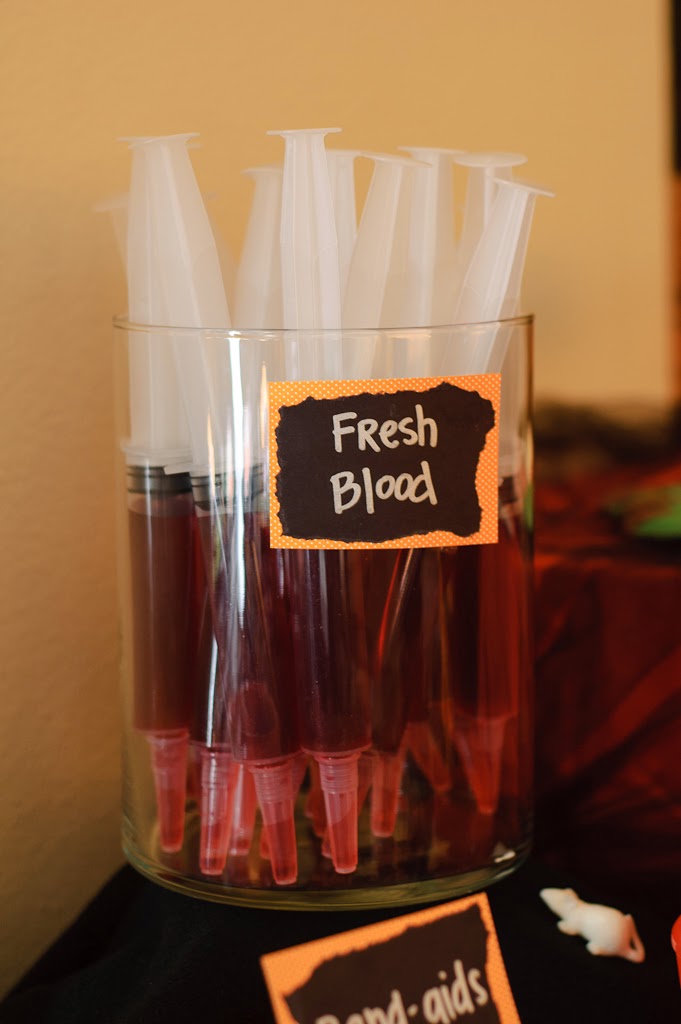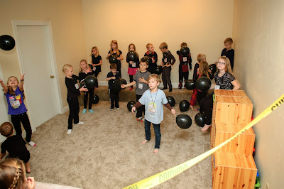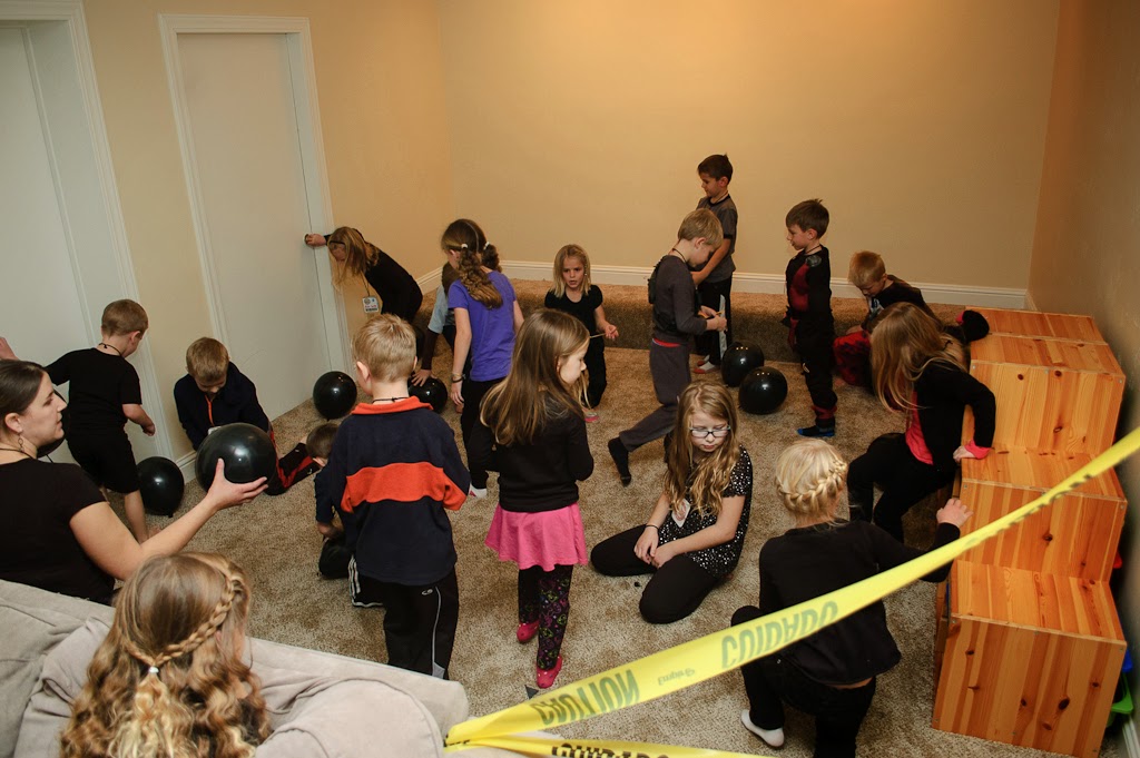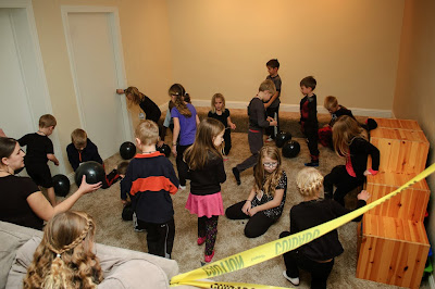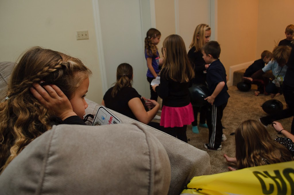 The next challenge was the laser trap. Johnny set up the black light with lasers (string) and the kids had to maneuver through them and deactivate a bomb (unwrap a tootsie roll) at the end. The next clue was inside one of those tootsie rolls. It was tiny and they had to use a magnifying glass to read it. It was really awesome. We had a blackout curtain at the opening of the hallway so the black light really worked well. A couple of the kids were too freaked out to even try it. Most of them (especially the boys) totally loved it!