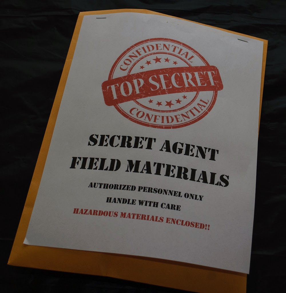 You can't tell in the picture but the "explosives" were a package of pop rocks. The packet of papers had crossword puzzles and word searches and sketch paper. The money was actually a notebook to take spy notes. I think Zack was the most excited about that one.