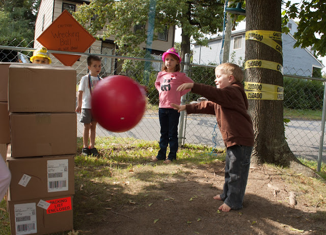 After they played for a little while we moved on to BARRICADE BOWLING where they used a wrecking ball. (Those "wrecking" balls were the take home gift with a label that said "Thanks for coming! We had a ball.")